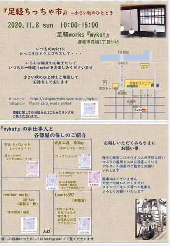 足軽ちっちゃ市 ■日時:11/8(日) ■時間:10:00~16:00 ■場所:足軽works 「mykot」(彦根市芹橋2丁目6−45)