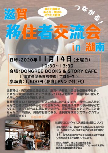 【つながる!移住者交流会 in 湖南】 滋賀に移住してきた人、移住したい人たちがざっくばらんに話し合える場です!繋がりや知り合い作りにぜひご参加ください。 ■日時:11/14(土) ■時間:10:30~13:30(開場10:00) ■場所:DONGREE BOOKS & STORY CAFE…